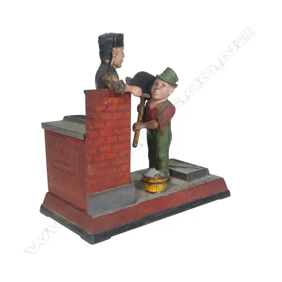 c.1887 for Charles G. Shepard, designed by Peter Adams and manufactured by Shepard Hardware Company. When a coin is placed into the hod box in the hands of the hod carrier, you press the lever to dump the coin into the hopper next to the brick mason while the brick mason raises his hands to mortar a brick to help build a wall. The bottom of the bank is marked “Excelsior Series Patd Fbry 8, 1887. The base coin cover absent. Working. L.190mm.