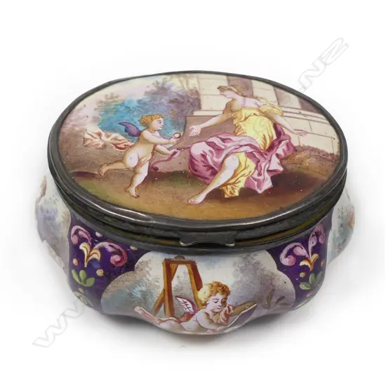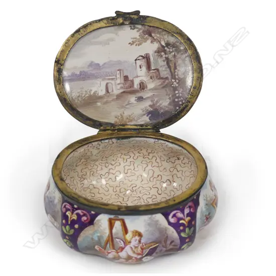 gilt metal mounts, the lid and serpentine body with hand painted cartouches of cherubs and a classical maiden. The interior lid with castle decoration. W.65mm.