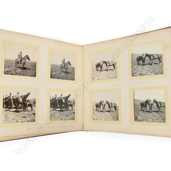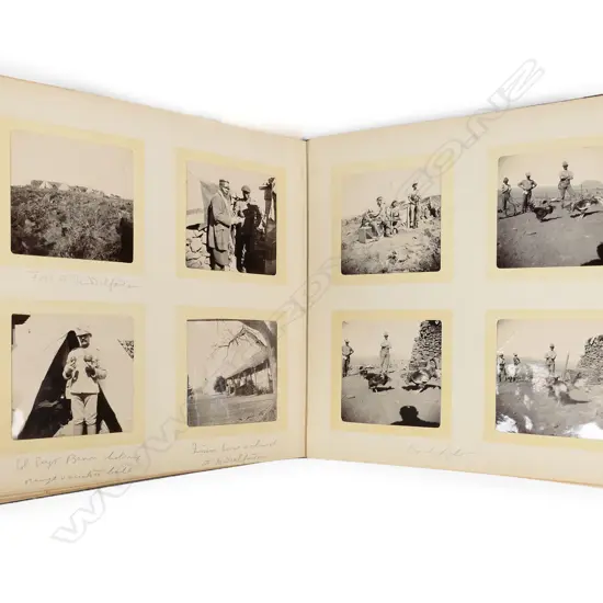 includes military snap shots in Africa, the transport ship The Canada, St. Helena, Durban, 'Jackson 5th New Zealanders', 'Self (W.T. Wyndowe)', soldiers on horses, 'Camp at Pietersburg', 'Zanzibar', 'The Sphinx', etc. Provenance: ex. the Mouton & Wyndowe families. Other quality items being sold by Cordy's from this estate.