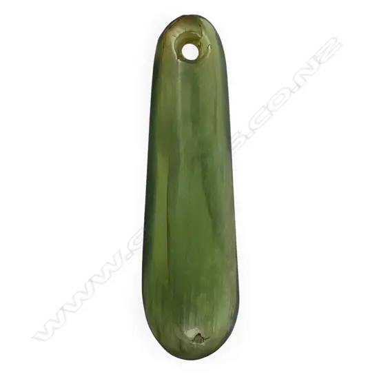 of opaque bowenite with hourglass suspension hole. L.57mm. Registered Y22934.