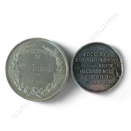 includes: 'New Zealand International Exhibition 1882 Awarded To Mrs Archibold For Cane Work' and 'Dunedin Poultry Pigeon Canary Cage Bird & Dog Society Exhibition 1890'. Both brooch fittings removed. Dia's.36 and 28mm.