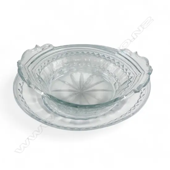 the oval wall with facet and notch detail, flared shaped and ridged handles. The conforming oval bowled stand with star base. L.285mm. H.130mm.
