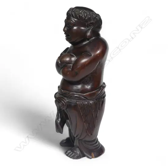 standing with arms crossed wearing a drape around his waist. Old shrinkage crack to front and repair to foot. Good old patina. H.325mm.