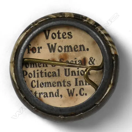 the tin badge with photo print of Pankhurst, the reverse printed 'Votes for Women. Women's Social & Political Union. 4 Clemens Inn, Strand, W.C.'. Note: By 1909 the Women's Social and Political Union was commissioning a wide range of badges, brooches, pendants, pins and hatpins. These raised funds for the campaign and helped to promote the votes for women cause.