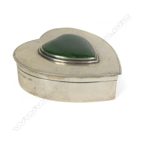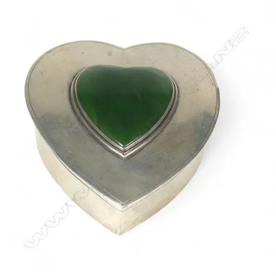 heart form with conforming pounamu applied panel to the hinged lid. Impressed maker's mark to base. 850 x 80mm.114gms.