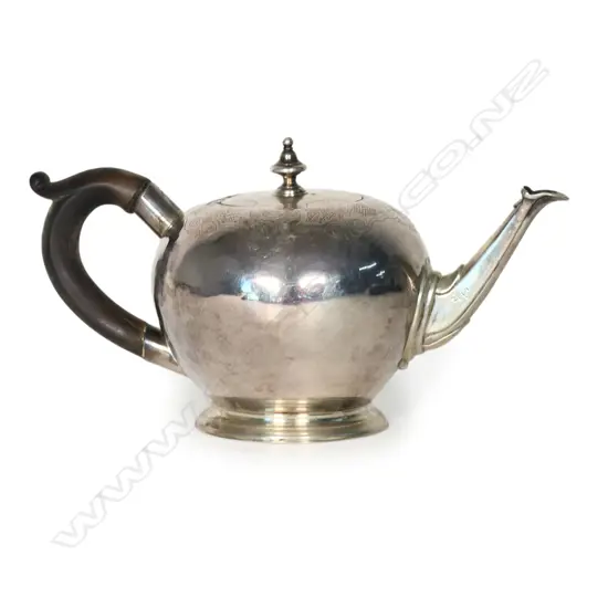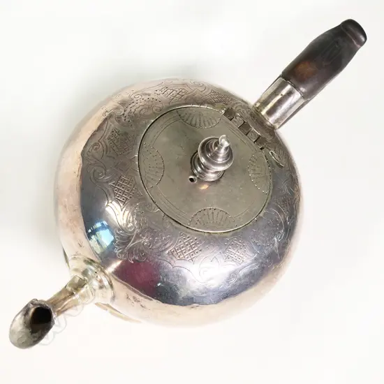 the top rim with a decorative engraved band of trellis, shell and scroll engraving, the lid with further shell engraving and fixed baluster finial, concealed flush hinge, restrained decoration to the spout, flared foot, carved wooden plain handle. London 1694, maker's mark 'HC', 3 pellets, mullet and 2 annulets. See Jackson page 148. 326gms. Dia.110mm. Additional catalogue note: Note: The base has been later soldered in, the item is of this period so we presume original base to the teapot.
