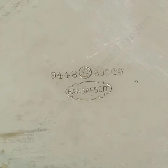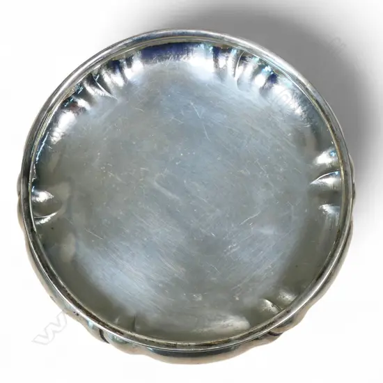 800 standard, mildly hand beaten, with broad swirling lobed sides and three short scroll feet. Dia.260mm. 450gms.