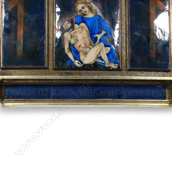 cloisonne enamel housed in a handmade silver gilt tabernacle frame, artist's monogram lower left, 435 x 485mm. Provenance: From the collection of a retired Auckland architect.