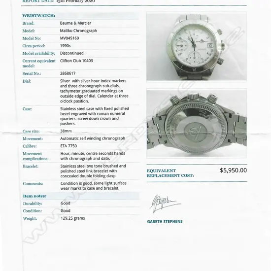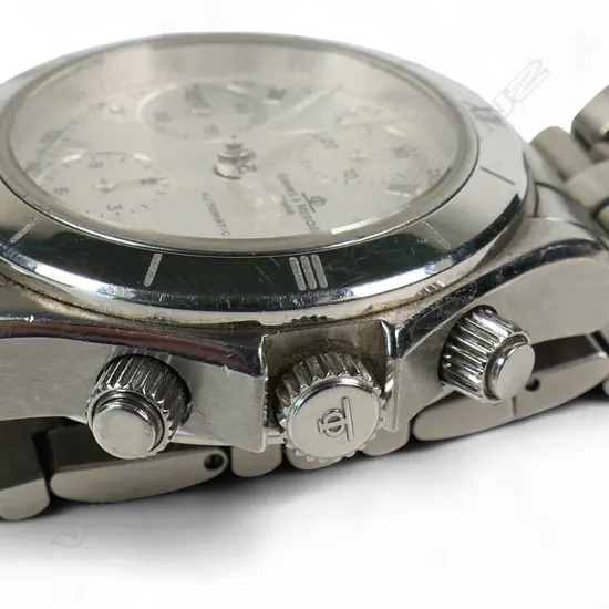 automatic, stainless, silver dial with hour index markers, three chronograph sub-dials, tachymeter graduated markings on outside edge of dial, calendar at three o'clock position. Valuation available. Please note: Cordy's do not guarantee the working order or time keeping of any timepiece.