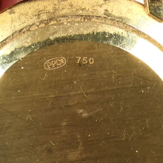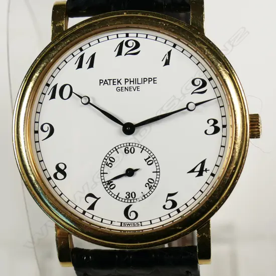 ref 5022J-013, manual wind calibre 215PS movement, ser no. 1880922, case no.4207537, 33mm diameter slim case with straight lugs, on black alligator leather strap with 18ct gold buckle. White dial with Arabic numerals, rail track minutes, subsidiary seconds dial at 6. The Calatrava model refers to the Calatrava Cross, the symbol of Patek Philippe and the Officer or Officer's-style dictates the restrained elegance of the circular case with straight lugs. CONDITION REPORT: Watch: Case: minimal signs of wear, no scratches to the crystal, minute marks to the case and caseback. Running. caseback marked PPCo in oval cartouche and 750. Gold assay marks on two lugs. Face: perfect Strap: 18mm black patent leather with simulated crocodile pattern, creased slightly on tongue strap from wearing Buckle: marked PPCo in oval cartouche and 750 and two gold assay marks, as the case - minute marks. Please note: Cordy's do not guarantee the working order or time keeping of any timepiece.