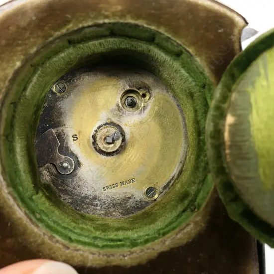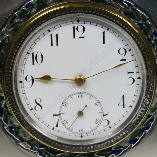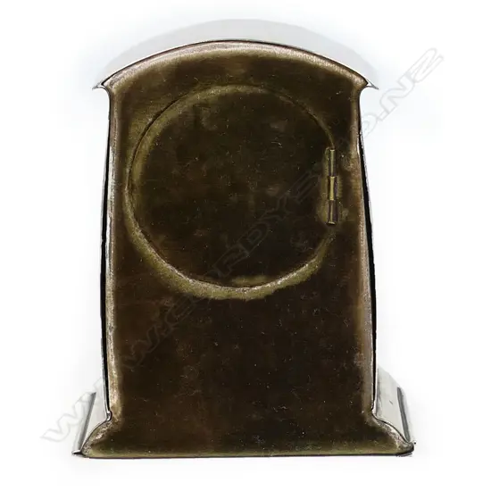 London 1912, of slightly tapering form, the white enamelled dial with black Arabic numerals, framed with an engraved leafy wreath band with enamelled detail, raised on a convex bracket type base. Key inside. H.97mm. Please note: Cordy's do not guarantee the working order or time keeping of any timepiece.