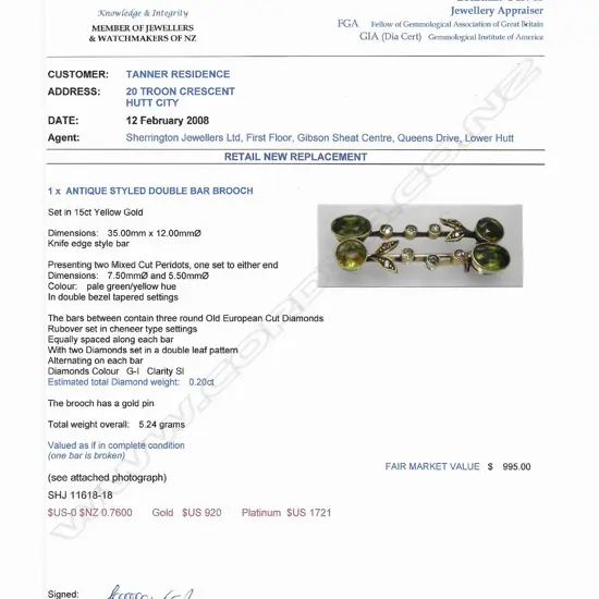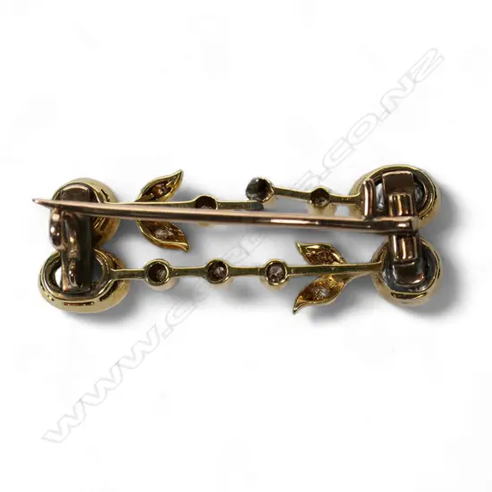 four facet cut peridots rub over set to each end of the two knife edge bars, each set with five small old European cut diamonds. TDW.0.10ct. Old valuation available.