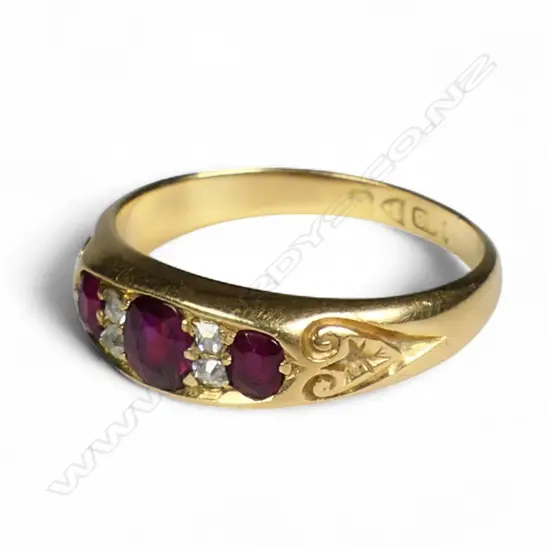 the three graduating oval cushion cut pigeon blood rubies spaced by two pairs of small old mine cut diamonds. Heart scroll engraved shoulders. Chester hallmarks showing wear. Ring size N. 4gms. Provenance: From the estate of Patricia Osborne of Avonside Christchurch. A keen jewellery collector for over 60 years.