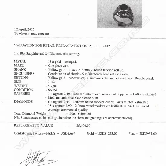a 1.60ct oval mixed cut medium dark blue sapphire in rub over mount, with three round brilliant cut diamonds to the top and bottom of the sapphire and smaller round brilliant cut diamonds to each shoulder. TDW. 0.90ct. Valuation available.