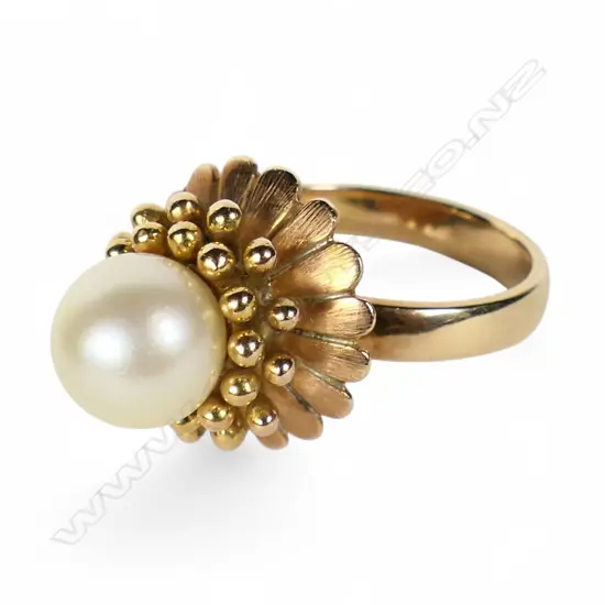 a 9mm round cultured pearl (deep cream lustre), set to the centre of stamens and petals representing a flower, plain band. 7.92gms. Size O