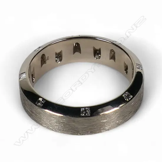 the designer ring of good width, the brushed top with chamfered sides set with 16 square diamonds of 0.32ct. 12.75gms. As new. Ex. The Jewellers Gallery, Auckland.