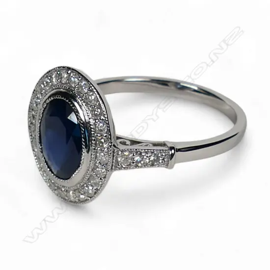 A 14ct white gold sapphire and diamond halo ring,