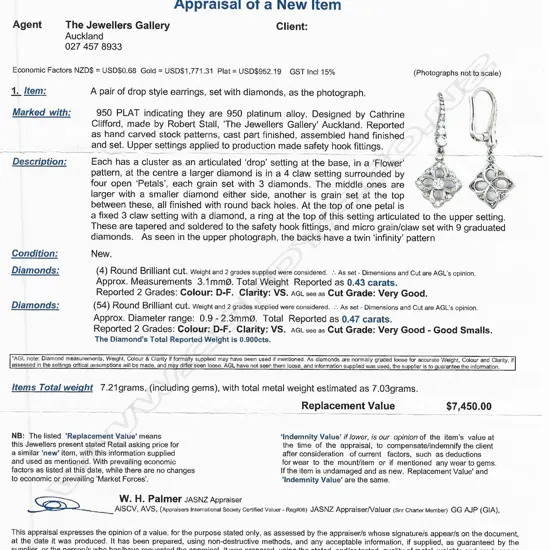 the long hooping mounts set with graduating diamonds supporting the open diamond quatrefoil form drops set with further diamonds. The 58 diamonds of 0.90cts. With valuation. As new. Ex. The Jewellers Gallery, Auckland.