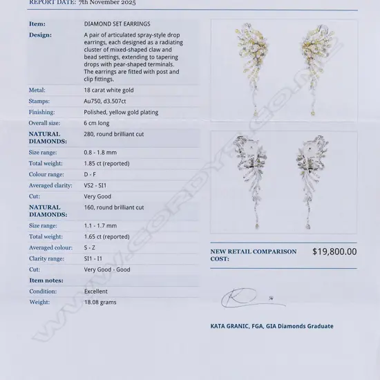 the articulated drop with scrolls, stylised star bursts, flowers and leaves encrusted with yellow and white round brilliant cut diamonds, posts for pierced ears with safety latch. TDW. 3.51ct (white 1.85ct, yellow 1.66ct). L. 60mm.