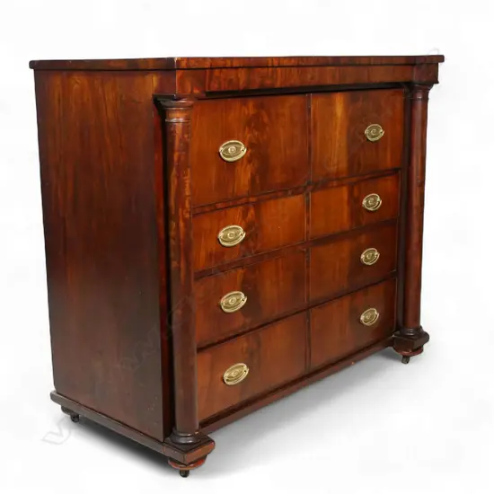 the top drawer fitted with further drawers, compartments and single door, above three graduating drawers, all flanked by plain turned full columns, raised on bun feet with casters. 1315 x 635 x 1175mm.
