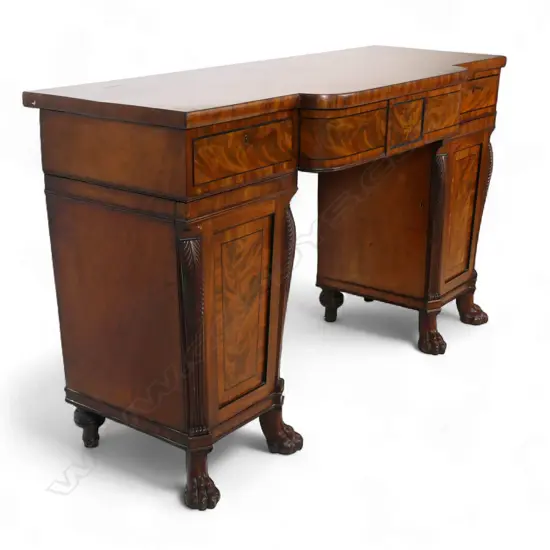 An elegant William IV flame mahogany breakfront twin pedestal sideboard,