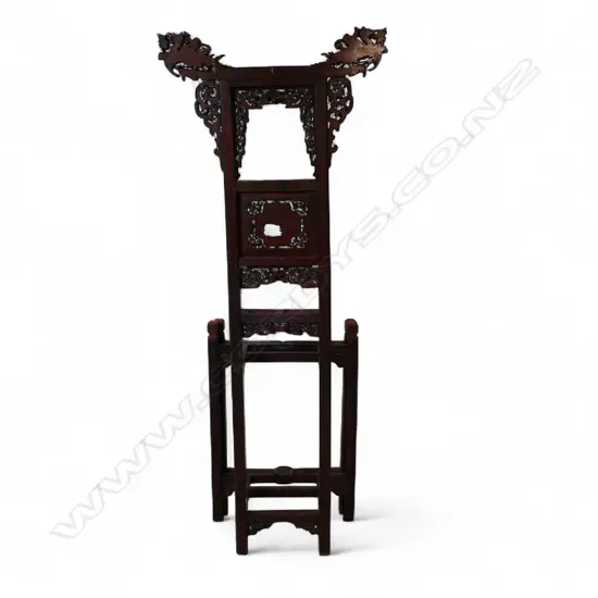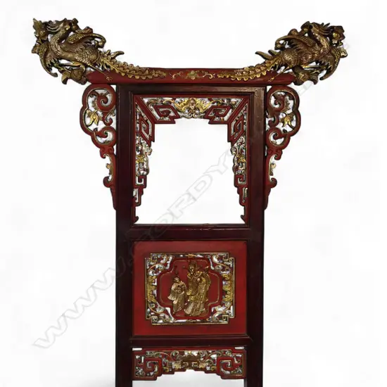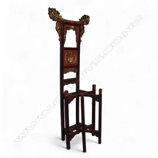 the high back with carved decoration, hinged front legs, red paint finish with gilded detail. 530 x 470 x 1700mm.