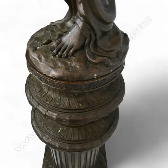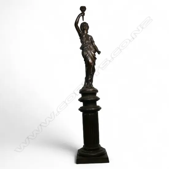 a Greek woman with draped dress holding a torch aloft, standing on a Greek column. Requires rewiring. H. 2280mm.