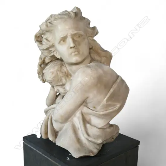 A marble sculpture of a mother and child,
