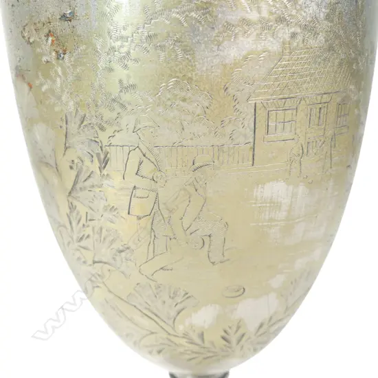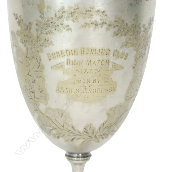 A late 19thC New Zealand historical silver plate trophy cup, presentation engraved ' Dunedin Bowling Club Rink Match 1887 Won By James Anderson. The front engraved with a bowling scene. The plating worn. H.210mm.