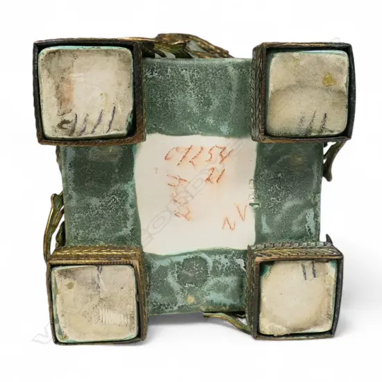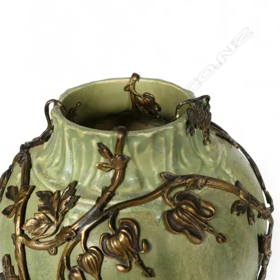 with ornate gilded brass vine overlay mounts. The lobed ovoid body on four-legged pedestal type base, mottled green jade like glaze. One foot with professional restoration. Impressed and hand written marks to base. H.225mm.