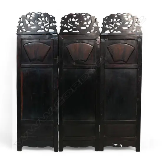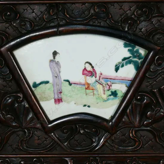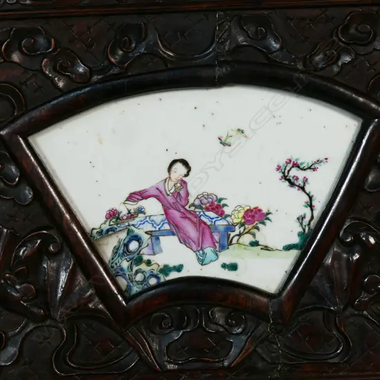 A Chinese Ching decorative carved hardwood and porcelain panelled three section folding screen,