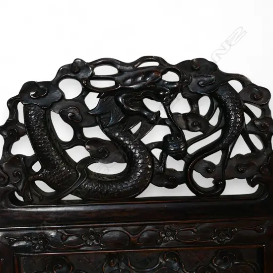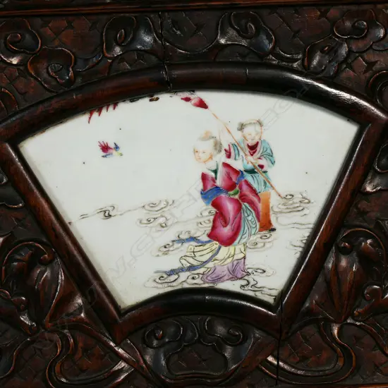 The fan form panels with famille rose painted figures in landscapes, the screen carved with dragons, bats, scrolls and blossoms. Reticulated arched pediment panels. 960 x 1080mm.