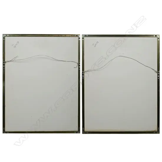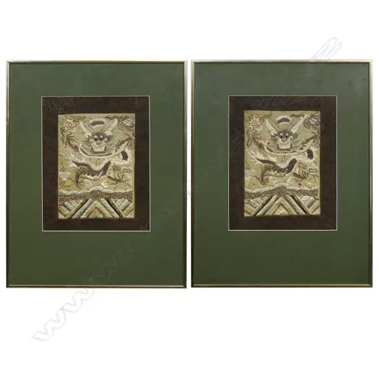 depicting sinuous dragons amongst clouds above a stylised land or sea scape. 320 x 260mm. Framed under glass.