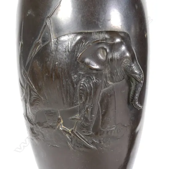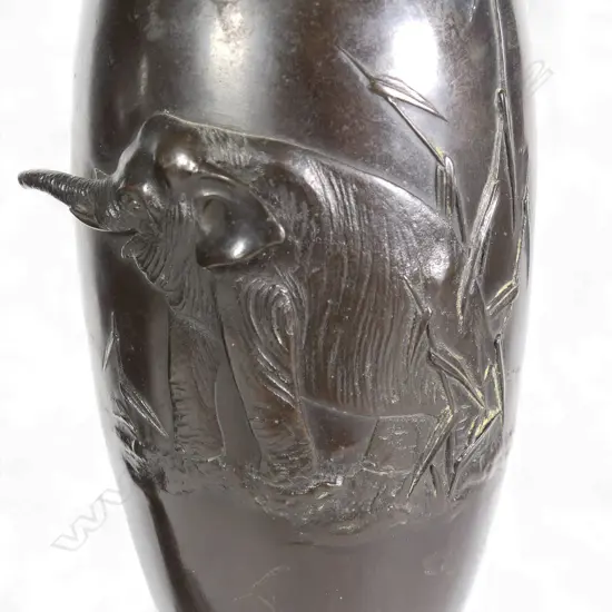 sculpted in relief with elephants amongst reeds, their trunks in three dimension. Signed in calligraphy to the base. H.335mm.