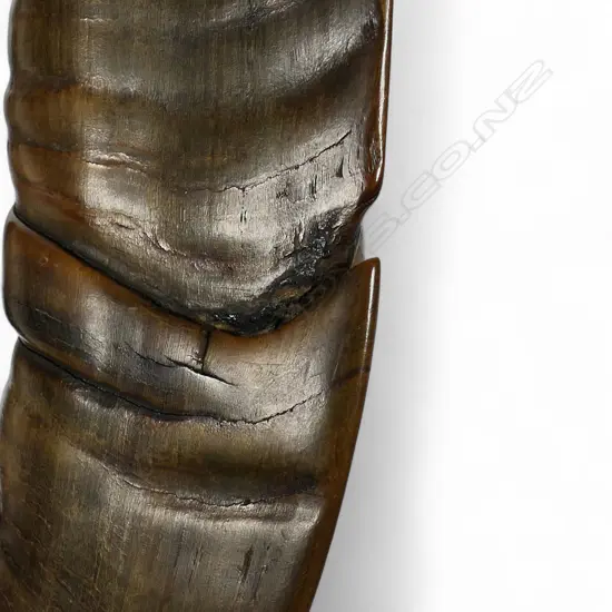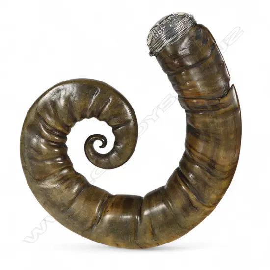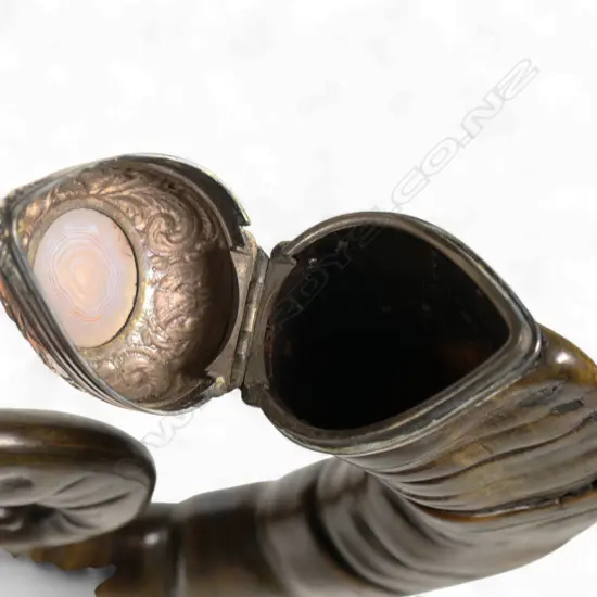 the scrolling horn with leafy scroll embossed hinged silver lid, apparently unmarked, set with a banded agate cabochon. 280 x 220mm.