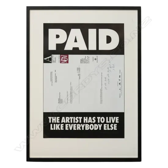 a 2001 paid Auckland Art Gallery invoice for conservation of six screenprints, signed. 420 x 295, framed under glass.