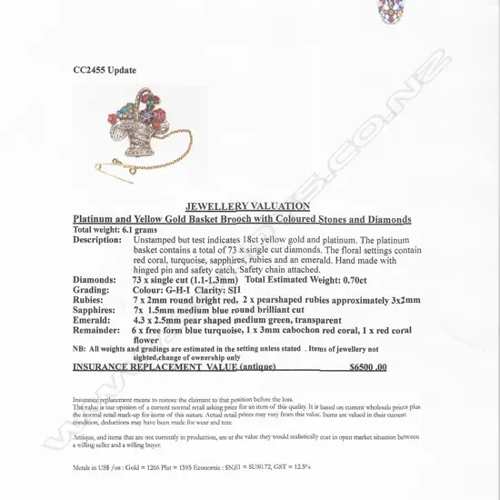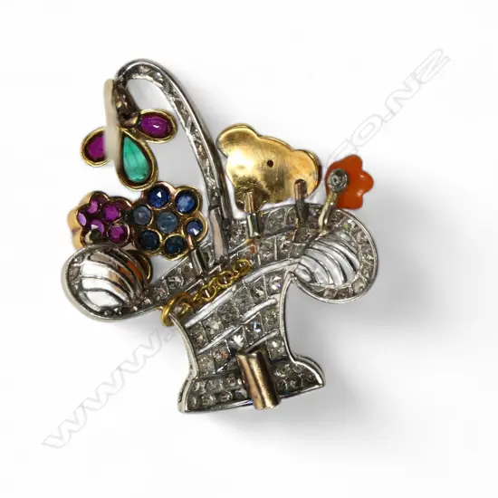 the basket set with 73 diamonds of 0.70cts. The floral setting of red coral, turquoise, sapphires, rubies and an emerald. 6.1gms. Valuation available.