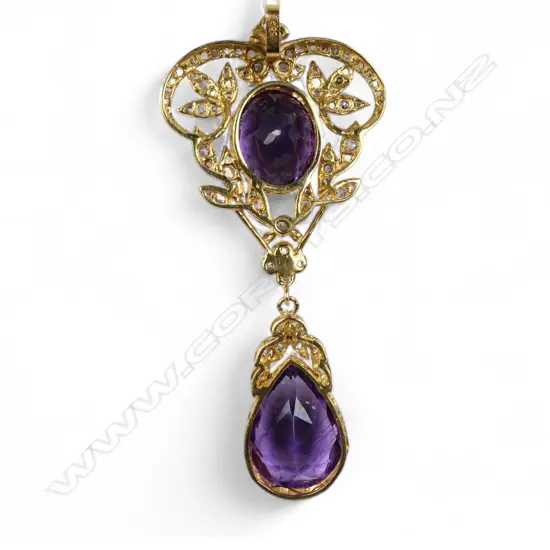 the leaf patterned frame embellished with old rose cut diamonds with an oval facet cut amethyst bezel set to the centre, suspended from the base is a pear cut bezel set amethyst and old rose cut diamonds, 14ct gold bale. TDW.1.15ct. TAW. 7.00ct. L.55mm.