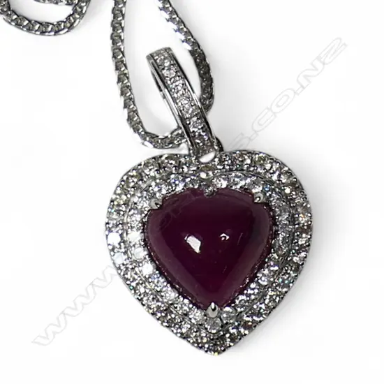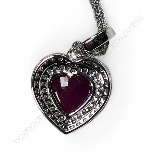 the heart form rubellite of 3.12cts framed by a double row of 65 small brilliant cut diamonds of TDW. 0.39ct. Suspended from a silver chain.