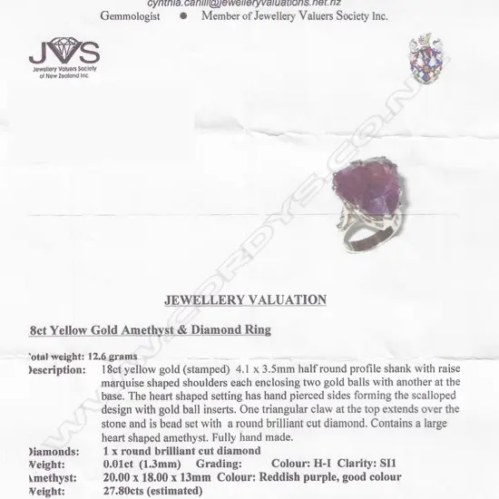 the large heart shape facet cut amethyst of approx. 27.8cts. Graded of 'reddish purple, good colour, with a single diamond set to the top triangular form claw. The coronet mount and shoulders with bead detail. 12.6gms.