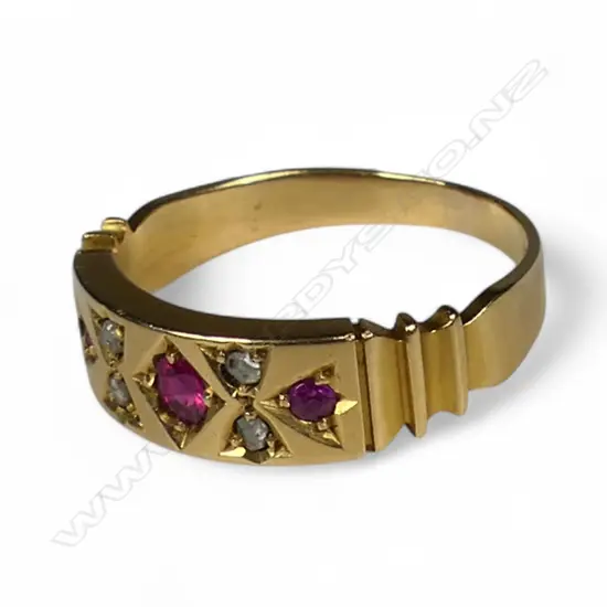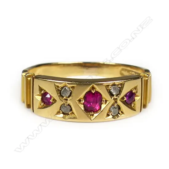 three facet cut rubies gypsy set with four old cut diamonds. Ring size K. 3.78gms. Provenance: From the estate of Patricia Osborne of Avonside Christchurch, a keen jewellery collector for over 60 years.