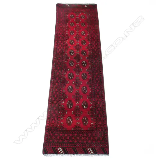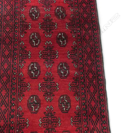 the field decorated with numerous medallions, multiple border guards, in rich red and black. 2900 x 800mm