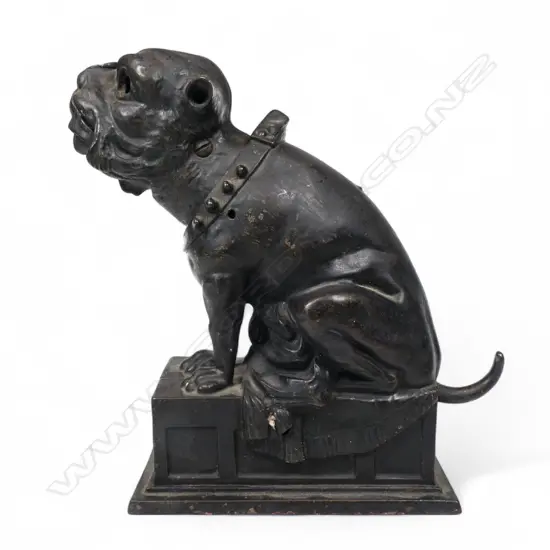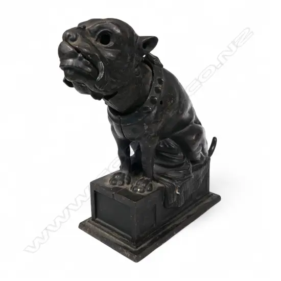named to the front. Operated by placing a coin on the dogs nose, then depressing the tail elevates a small section on the nose, withdrawing the head and opening the mouth to where the coin falls. One glass eye absent. Marked on base PATP APR 27, 1880, and on trap PAT FEB 2, 1875. H.195mm. Provenance: The estate of Patricia Osborne - Christchurch.