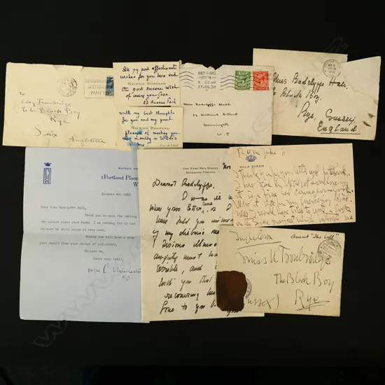 dating from 1928 to 1940. These include letters from Colette to Una and ‘John’ (Hall), some concerning ‘The Well of Loneliness’, as well as a French publisher asking Hall to write about Colette from an English perspective for a book being about her works. In a later letter to Troubridge, she called the book by Claude Chauvière, ‘un outrage aux yeux et à la politesse’. One letter from George Bernard Shaw concerns the upcoming trial in England surrounding the publication of ‘The Well of Loneliness’, he writes, ‘I have sketched the line of defence more fully...but the danger is that counsel will refuse to adopt it.’ Also, a letter from John Gielgud concerning a possible adaption of her novel. Additionally included are: photos, cheques signed by Hall, her passport, tickets and a programme for the opening night of ‘Le Procès d'Oscar Wilde’ (‘The Trial of Oscar Wilde’) at Theatre de L’Oeuvre and many other items. Note: Radclyffe Hall (Marguerite Radclyffe-Hall) was an English writer best known for the groundbreaking lesbian work ‘The Well of Loneliness’ (1928) which was banned in 1928 in Britain as ‘obscene libel’ and not published for 20 years. Lady Una Troubridge (Margot Elena Gertrude Taylor) was an English sculptor and translator – best known for her translation into English, of the works of Colette, who was one of France’s leading writers in the first half of the 20thC. Provenance: [Lady Una Troubridge by bequest to friends Nicola Rossi-Lemeni and his wife Operatic Soprano, Virginia Zeani, 1963, thence by bequest to the vendors in the 1990s. Full inventory of contents available at enquiries@cordys.co.nz
