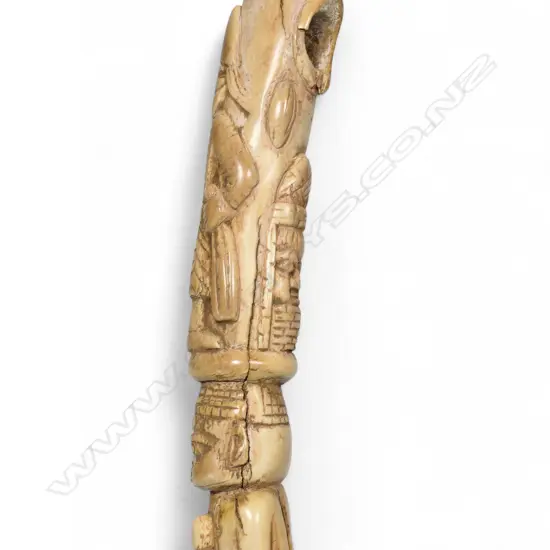 carved with sacred and ceremonial figures, much like a totem. Possibly a flute or trumpet. Stained to a deep caramel tone with age cracks. L.540mm.