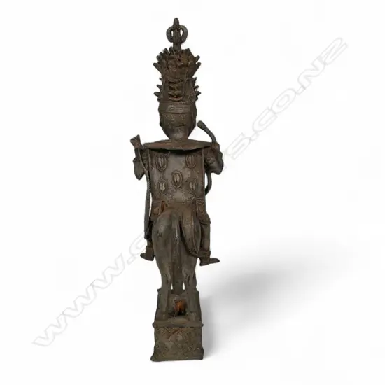 a figure, possibly royal, astride a horse, the horse wearing some form of armour, the figure with elaborate helmet and dress. (Some casting faults). H. 560mm.