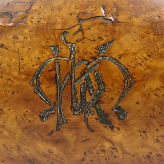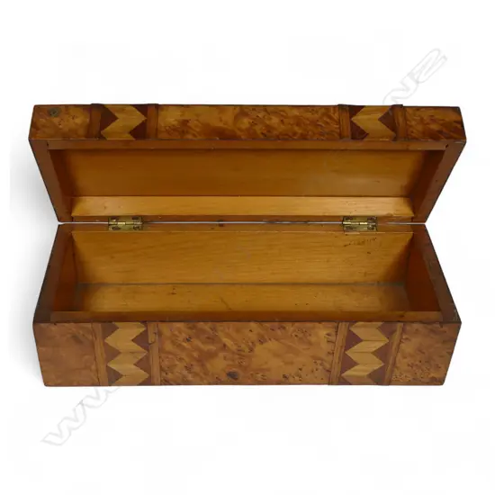 inlaid design to the slightly domed lid along with carved initials, design continues down the front of box. 285 x 110 x 105mm. Provenance: From the collection of the late John Statham.
