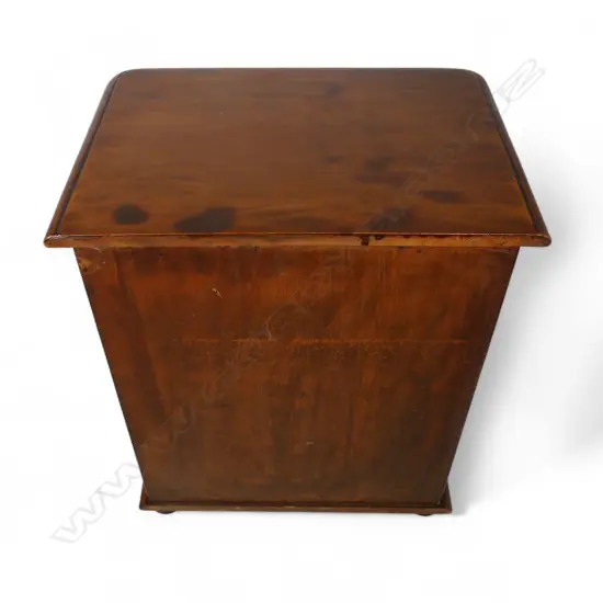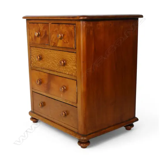 the carcass in kauri with various wood veneers to the drawer fronts. Raised on bun feet. 330 x 240 x 370mm. Provenance: From the collection of the late John Statham.