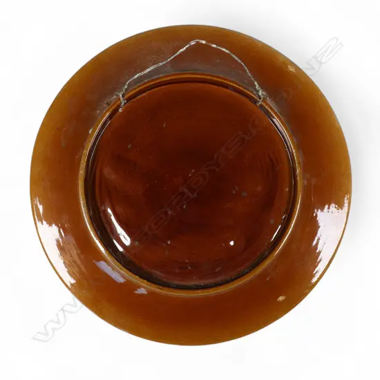 model #1022, the brown glazed centre with a 'postured presentation of a Hei Tiki', the green glaze border with 'patapata' designs. Two suspension holes to the reverse. Dia.255mm.