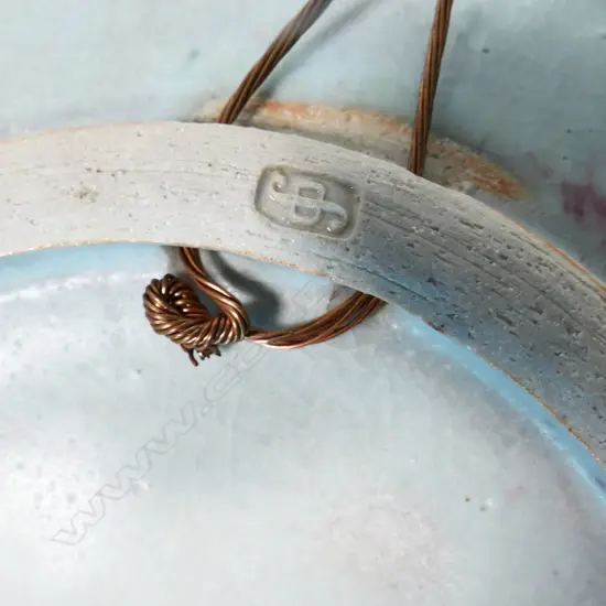 the rim with four impressed highlights, the variable turquoise blue glaze with darker pool to the center. Impressed potter's marks. Dia.380mm.